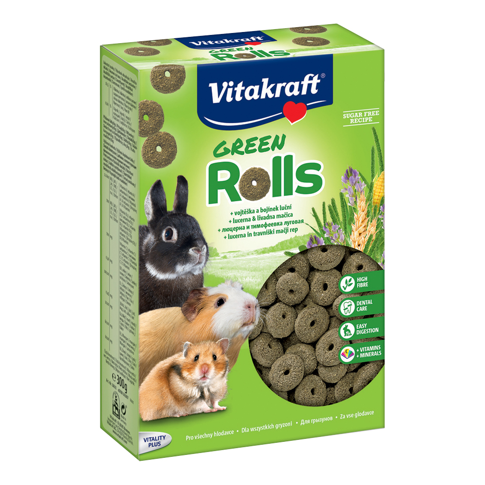 Το Green-Rollis® περιέχει ζωτικές βιταμίνες, μέταλλα και ιχνοστοιχεία για βέλτιστη παροχή και υποστήριξη της πέψης και της φθοράς των δοντιών των ζώων με πολλές ακατέργαστες ίνες. Επιπλέον, τα μικρά δαχτυλίδια έχουν υπέροχη γεύση και, χάρη στο στρογγυλό τους σχήμα, εξασφαλίζουν διασκέδαση και ποικιλία στην καθημερινότητα με τα τρωκτικά. Ιδανική προσθήκη σε μια ισορροπημένη διατροφή!